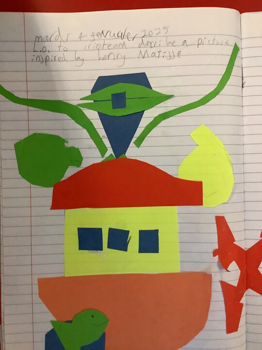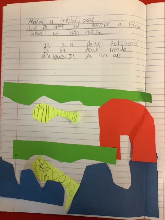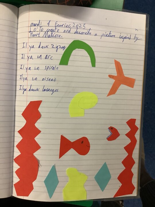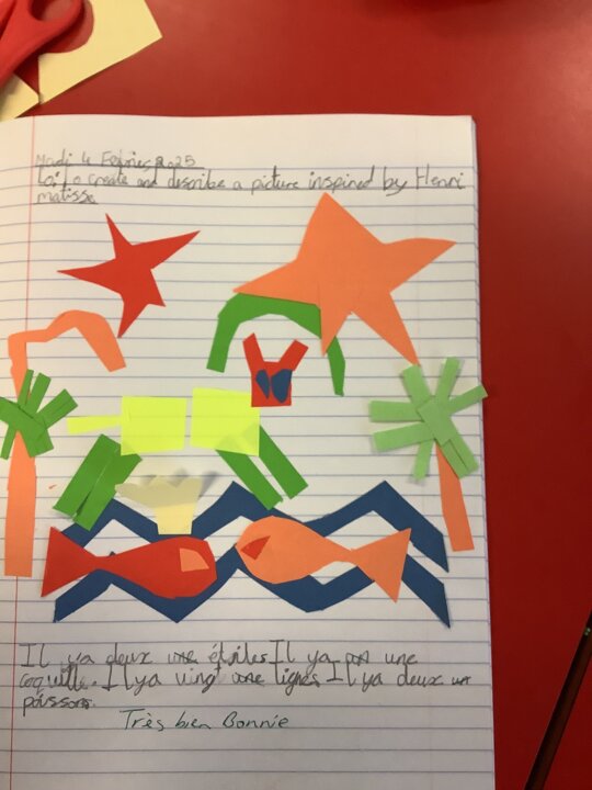 Class 2 have worked hard consolidating their knowledge on Henry Matisse by creating their own French art designs inspired by him. They used the shapes and objects that he used in his collages and described their work in French.
