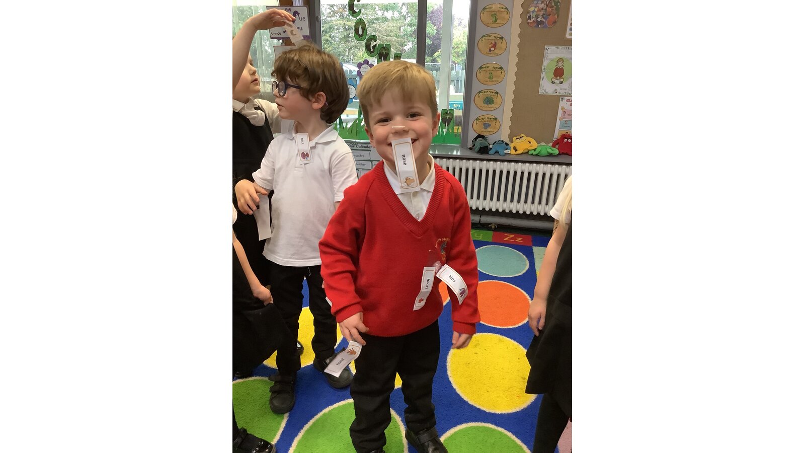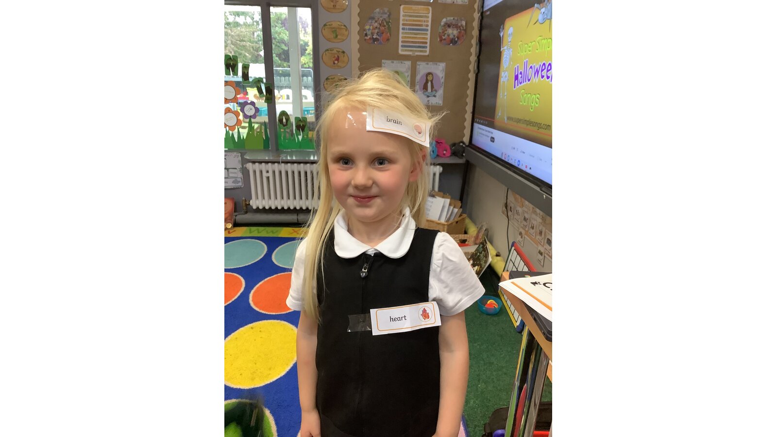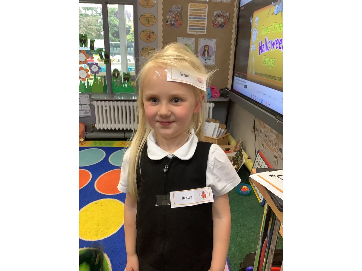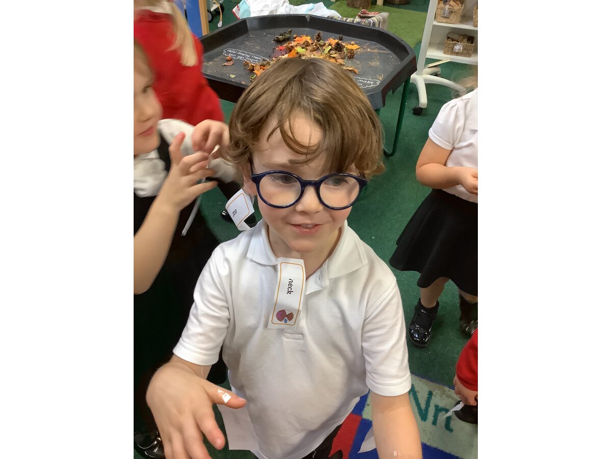 We had so much fun this afternoon in Class 1! This week we have been learning all about the body, in particular the skeleton. We have listened to stories and written about the characters from the Allan Alhberg, ‘Funny bones’ story books, our favourite being ‘Bumps in the night’. The children have loved listening to stories involving Big skeleton, Little skeleton and Dog skeleton. As part of our afternoon activities this week, the children were challenged to read and label Mrs Powles. They had so much fun sellotaping the labels to Mrs Powles. After labelling their teacher they decided it would be fun to label each other. They were brilliant at labelling the body parts that they could see and even some of the organs that we cannot see, such as the heart and brain. Great work Class 1!